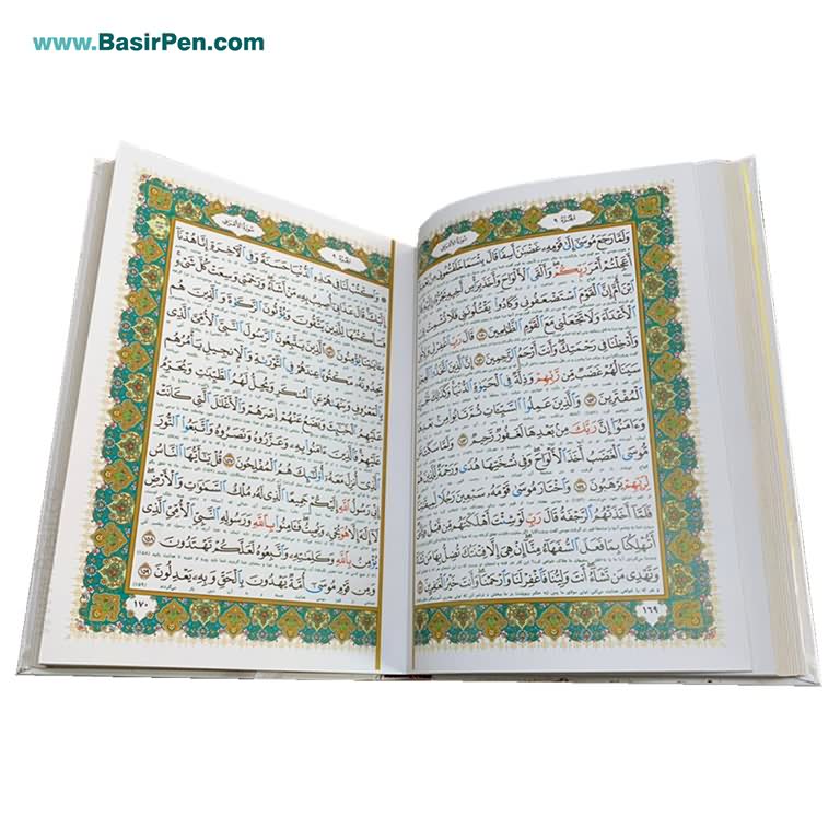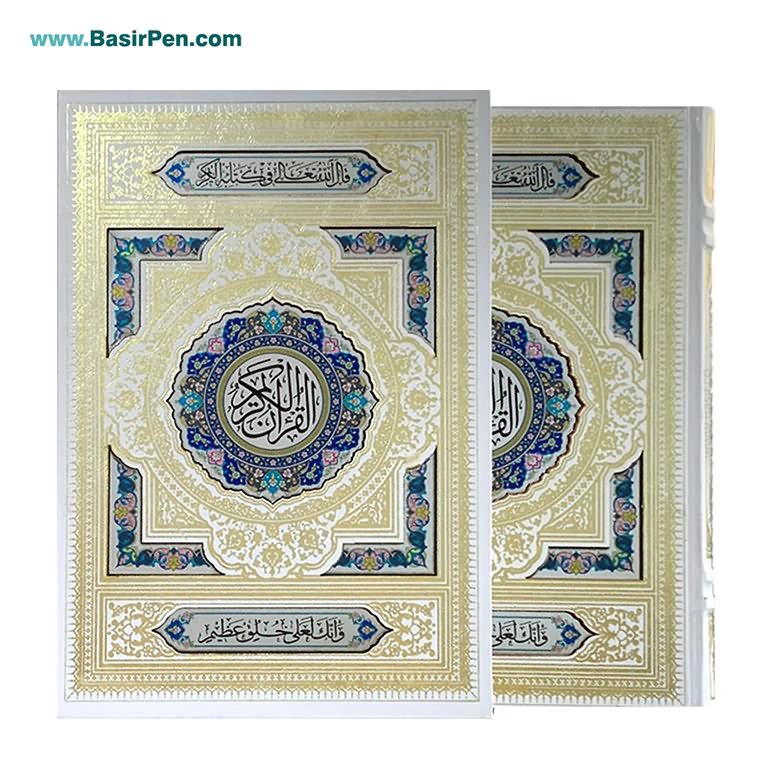 کتاب نفیس قرآن سفید (قرآن عروس) بصیردارای پلاک نقرهای با چاپ تذهیب رنگی بسیار زیبا همراه با طلاکوب کاغذ گلاسه لبه طلا خط عثمان طه همراه با ترجمه فارسی و چاپ کاملا رنگی در قطع وزیری با طرح بسیار زیبا، هدیه کاملا نفیس و زیبا و مناسب جهت استفاده در مراسم عقد و ... توجه: این کتاب توسط موسسه فرهنگی بصیر به چاپ رسیده و قابلیت قرائت با انواع قلم قرآنی سری جدید موسسه بصیر را دارد.