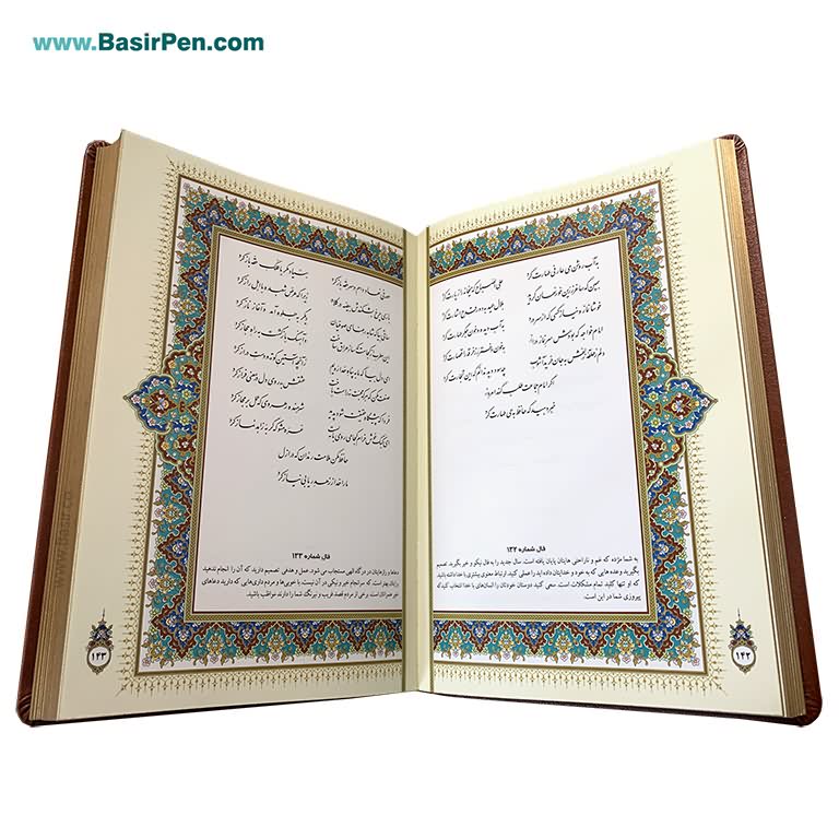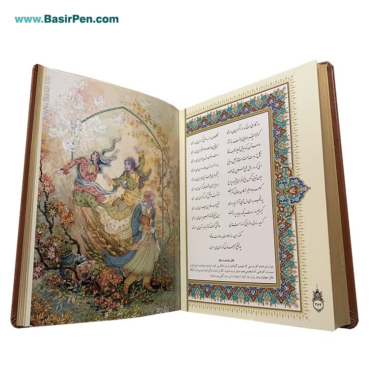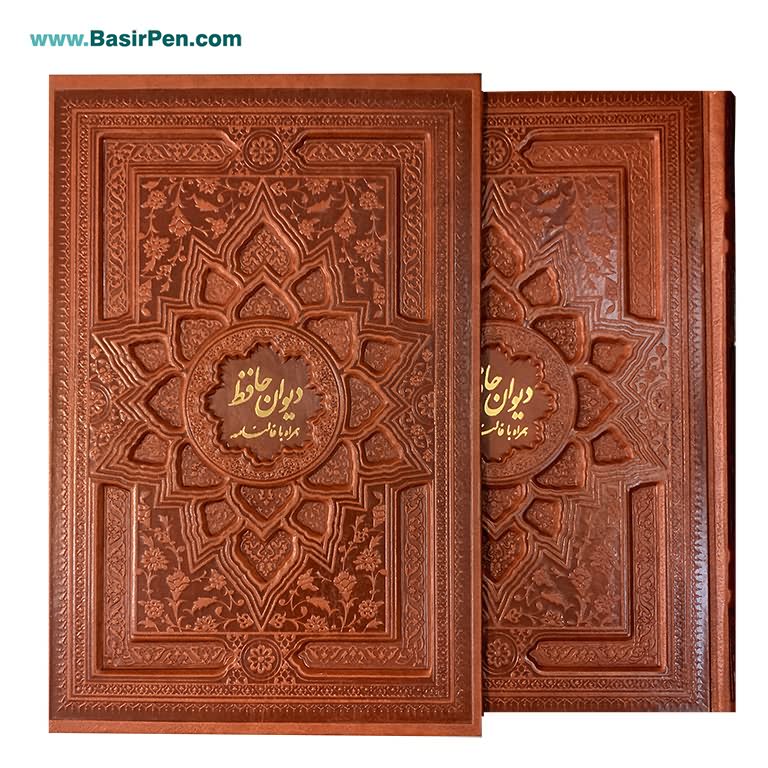 کتاب نفیس دیوان حافظ شیرازی چرمی بصیرهمراه با قاب کشویی چرمی طرح برجسته قطع وزیری با کیفیت عالی کاغذ گلاسه چاپ کاملا رنگی با تذهیب بسیار زیباخط استاد محمد مهدی منصوری تولید و توزیع به صورت عمده توسط موسسه فرهنگی بصیر