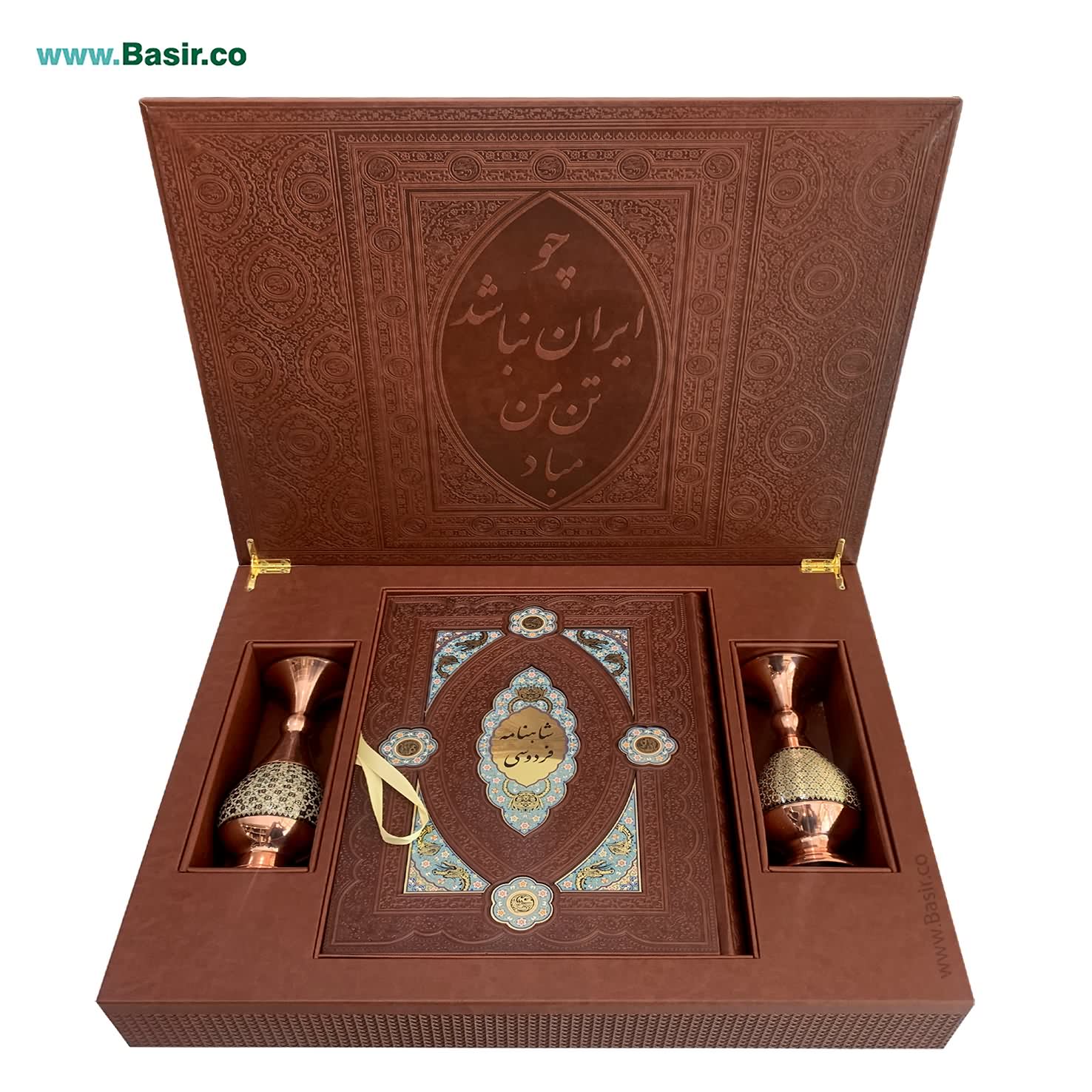 مجموعه بسیار نفیس و زیبا شامل یک عدد شاهنامه نفیس چرمی پلاک رنگی جلد چرمی (ترمو) با کاغذ گلاسه و چاپ رنگی و کیفیت عالی به همراه دو عدد گلدان خاتم کاری بسیار زیبا داخل جعبه که هدیه ای بسیار ارزشمند و زیبا برای تمامی افراد به شمار میرود. این مجموعه بسیار نفیس و زیبا توسط این موسسه با بهترین قیمت و تخفیف عالی به صورت تک فروشی و یا در تعداد بالا توزیع می گردد.