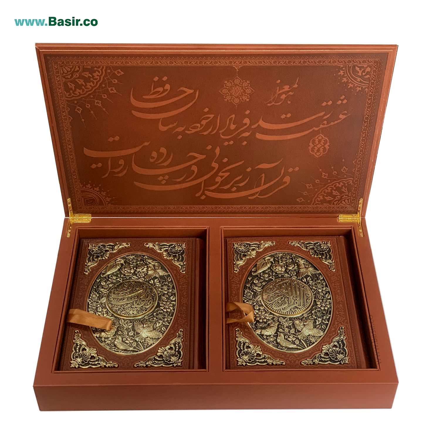 مجموعه نفیس کتاب قران و کتاب دیوان حافظ نفیس جلد چرمی تلفیق با لوح مسی بسیار زیبا همراه با جعبه چرمی برجسته با طرح مس که با توجه به ظاهر زیبا و کیفیت عالی کتاب و صحافی مورد توجه و استقبال هموطنان عزیز قرار گرفته است. این مجموعه به صورت مستقیم توسط این مرکز به سراسر ایران با بهترین قیمت و تخفیف های ویژه ارسال می گردد. جهت مشاهده مشخصات کامل محصول به بخش مشخصات محصول در پایین صفحه مراجعه نمایید.