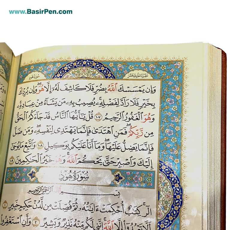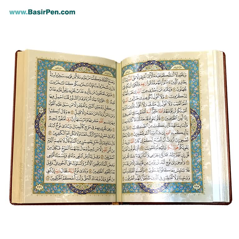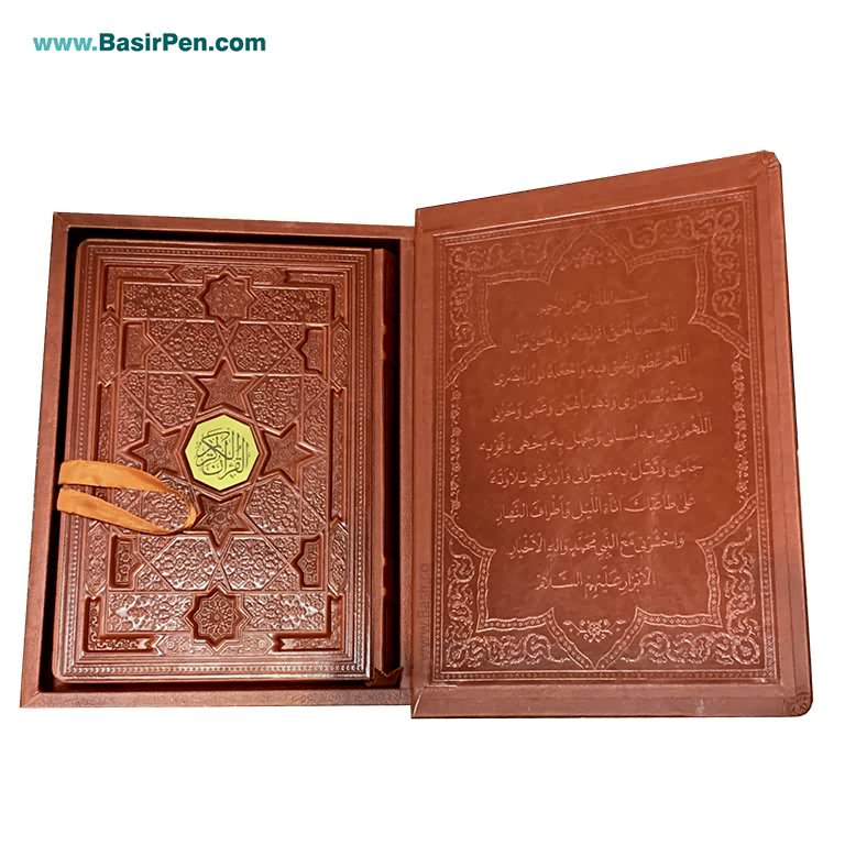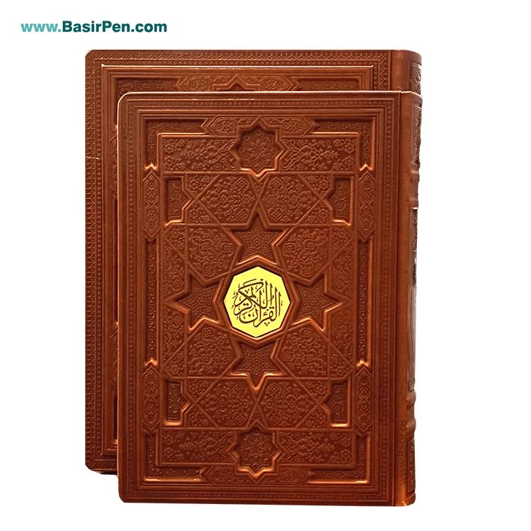 کتاب قرآن نفیس و معطر بصیر همراه با قاب بازشو (جعبه صندوقی) با جلد و قاب چرمی طرح برجسته بسیار زیبا همراه با پلاک طلایی و چاپ کاملا رنگی با تذهیب چشم نواز و زیبا بر روی بهترین کاغذ معطر طرح ابر و باد لبه طلا با کیفیت عالی، توسط انتشارات نوین بصیر به صورت عمده تولید گردیده و در داخل و خارج از کشور مورد استقبال هموطنان عزیز قرار گرفته است. هر جلد قرآن کریم به صورت شیرینگ شده ، داخل ضربه گیر و کارتن تکی می باشد و هر 8 عدد کارتن تکی داخل یک کارت اصلی قرار گرفته اند.محصولات بصیر با بهترین قیمت و تخفیف های عالی به صورت تکی و یا در تعداد با تخفیف پله ای توزیع می گردد.
