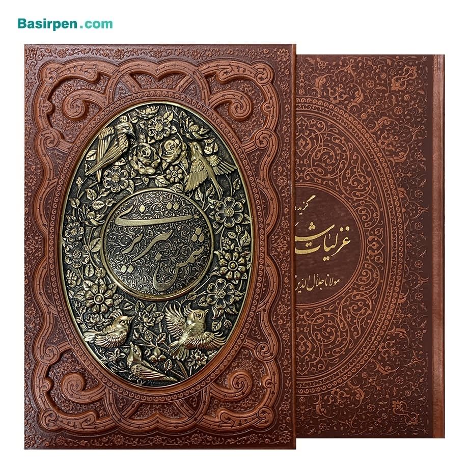 کتاب نفیس غزلیات شمس همراه با قاب کشویی طرح چرم و مس برجسته همراه با تذهیب بسیار زیبا و چاپ کاملا رنگی بر روی کاغذ گلاسه هدیه ای نفیس و ارزشمند که توسط انتشارات نوین بصیر به صورت تک و یا در تعداد بالا با تخفیف های ویژه ارائه می گردد.