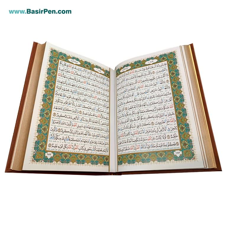 تولید و توزیع توسط موسسه فرهنگی قرآنی بصیرقابل قرائت با انواع قلم هوشمند قرانی سری جدید بصیرجلد چرمی خط عثمان طه با ترجمه مهدی الهی قمشه ای چاپ 5 رنگ، کاغذ گلاسه با کیفیت صحافی عالی(حروف ناخوانا با رنگ آبی جهت قرائت روانتر)
