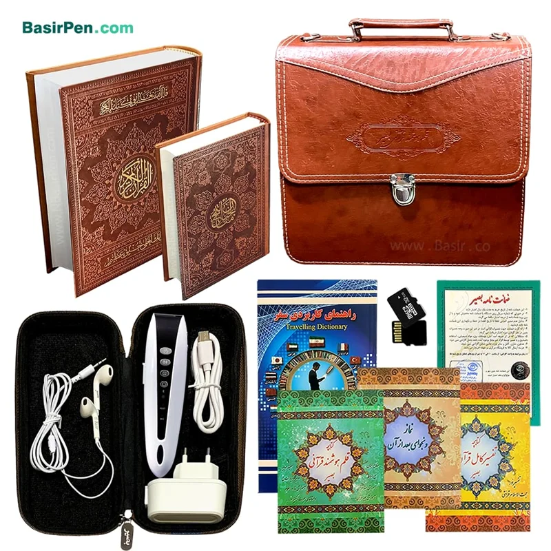 کامل ترین و آخرین بسته قلم قرآنی بصیر با امکانات عالی و بی نظیر که به صورت ویژه توسط این مرکز عرضه می گردد .این بسته همراه با قرآن وزیری بسیار درشت خط (1208 صفحه ای و درشت خط ترین کتاب ویژه قلم هوشمند قرآنی) دارای ترجمه فارسی زیر، کتاب منتخب مفاتیح درشت خط، دفترچه های گوناگون و کاملترین امکانات همراه با کیف طرح چرم با قلم هوشمند با کیفیت بسیار عالی و قابلیت به روز رسانی و با قابلیت استفاده از جدیدترین کتاب های تولید شده توسط موسسه بصیر گامی جدید در نسل قلم های هوشمند نهاد. این بسته از هر لحاظ مورد تائید شرکت بصیر است و نسبت به بسته های مشابه دارای کیفیت و امکانات عالی و بی نظیر است که توسط این موسسه با قیمتی مناسب و پشتیبانی عالی توزیع می گردد. همچنین مجوز سازمان دارالقرآن جمهوری اسلامی ایران در انتهای کتاب قرآن این بسته چاپ شده و قلم قرآنی دارای کیفیت عالی با یک سال گارانتی تعویض و سه سال خدمات پس از فروش می باشد.
