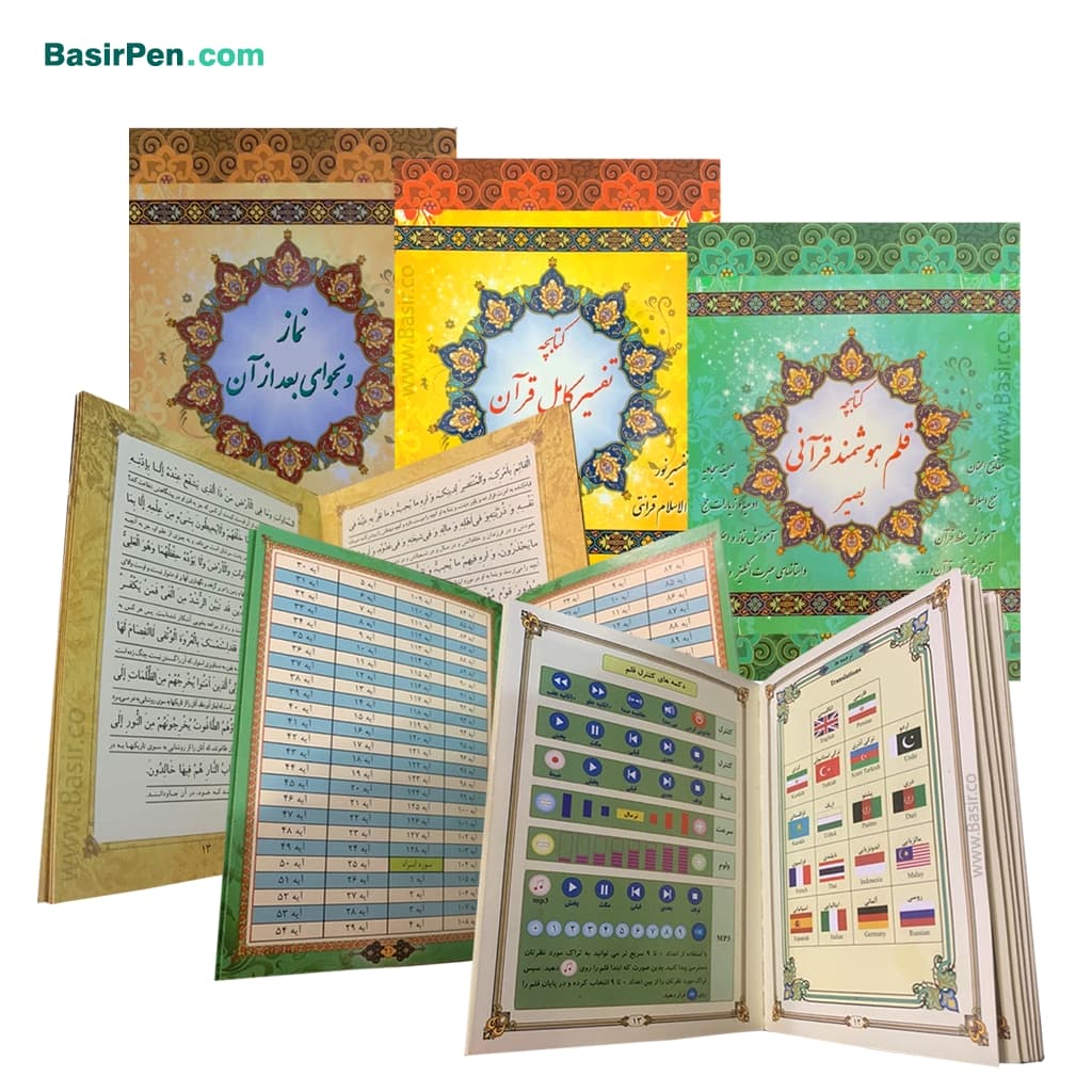 * کتابچه تفسير کامل قرآن بصير (قابلیت خواندن صوت، ترجمه یا تفسیر هر آیه از هر یک از سوره های قرآن از روی دفترچه جیبی کوچک همراه تنها با یک اشاره قلم قاری و استفاده به عنوان قرآن جیبی همراه).